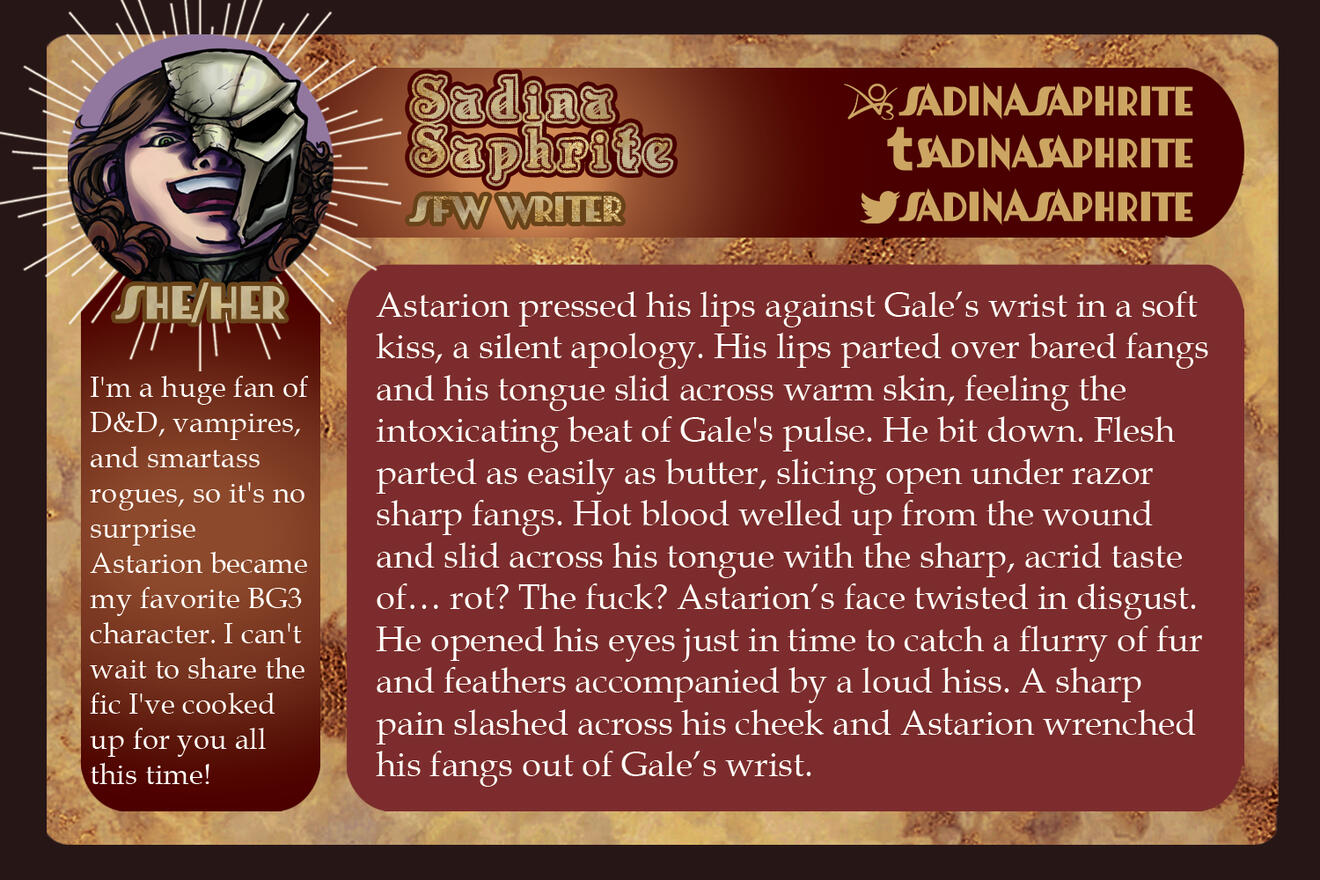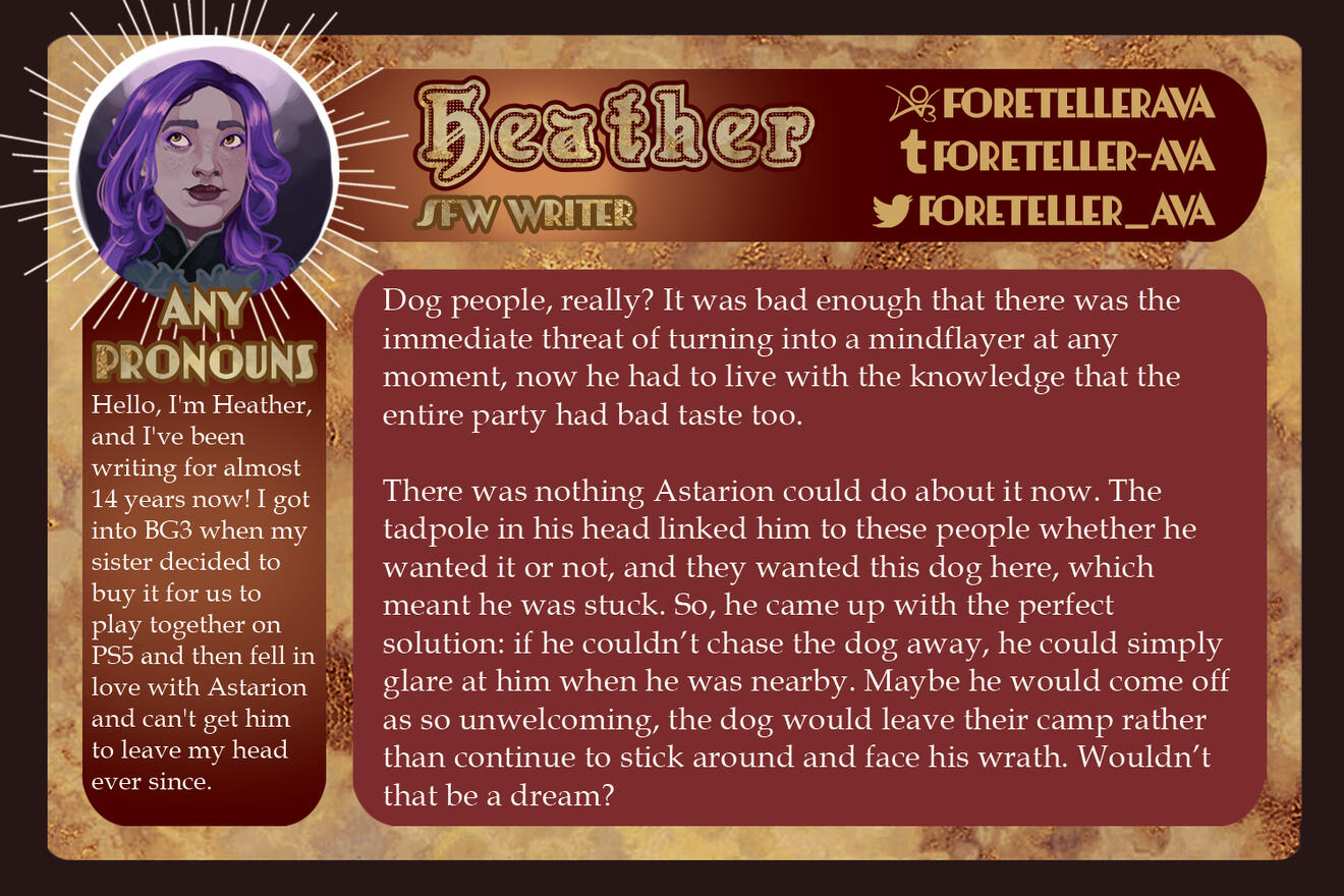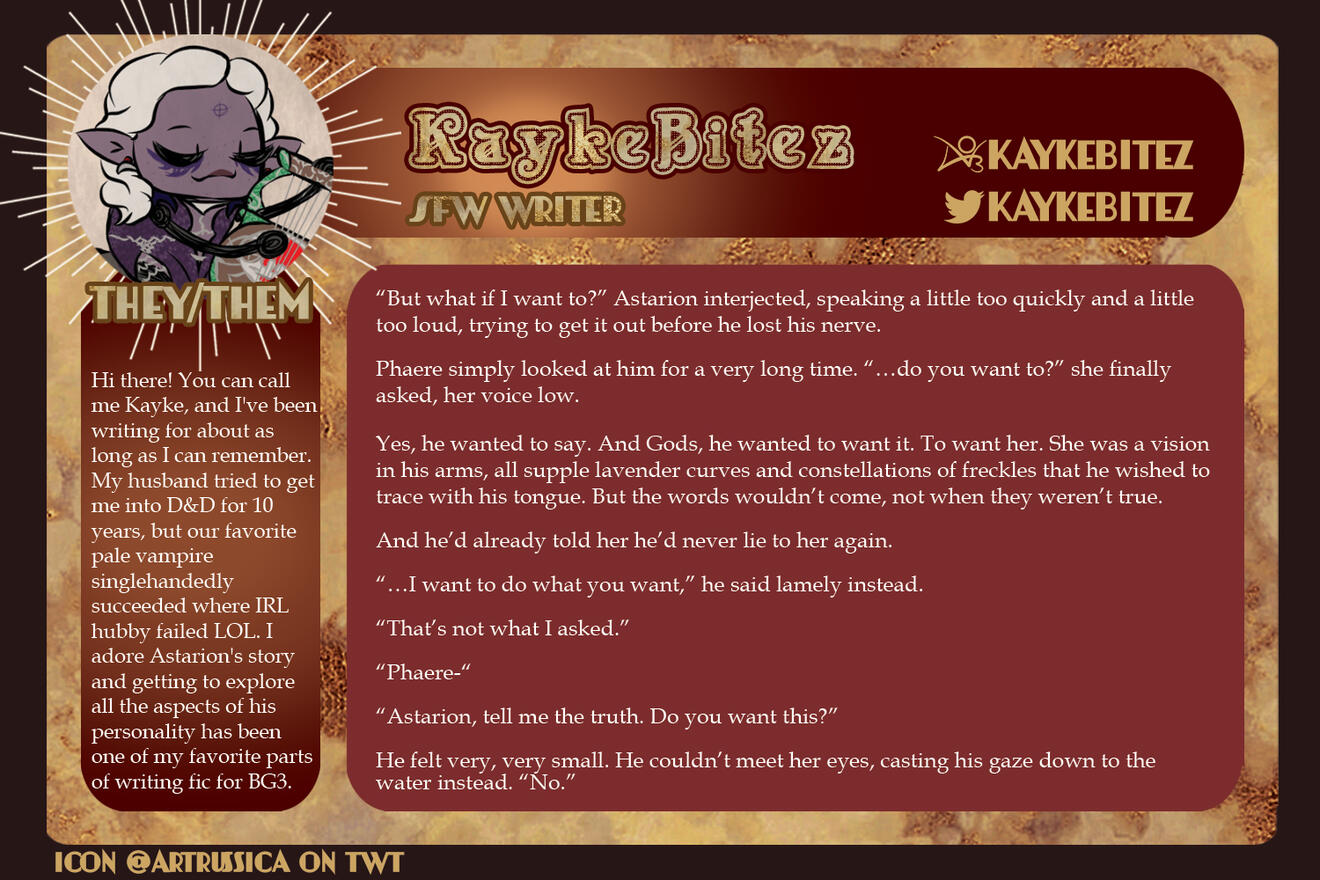 3-5 high-quality samples of your writing. Not all of them have to be BG3 or Astarion related, if at all. Samples will give us a quick look into your work and can be included in your portfolio if you so choose.
