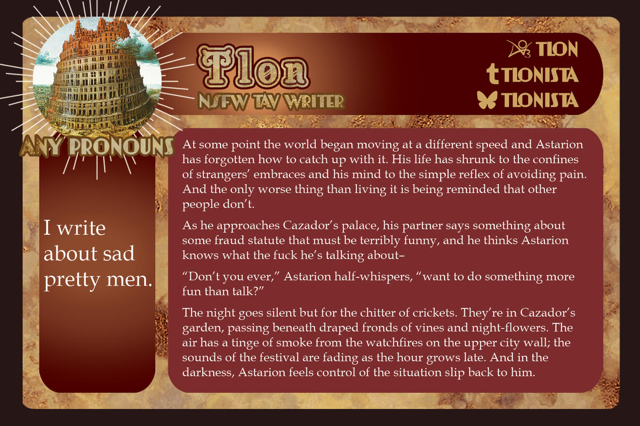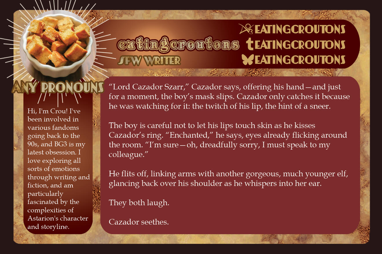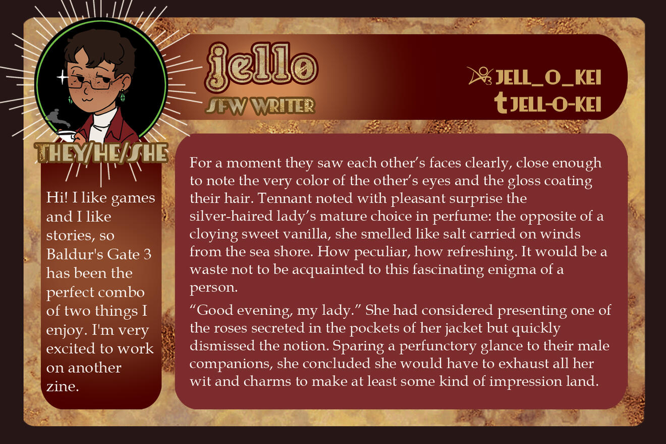 3-5 high-quality samples of your writing. Not all of them have to be BG3 or Astarion related, if at all. Samples will give us a quick look into your work and can be included in your portfolio if you so choose.