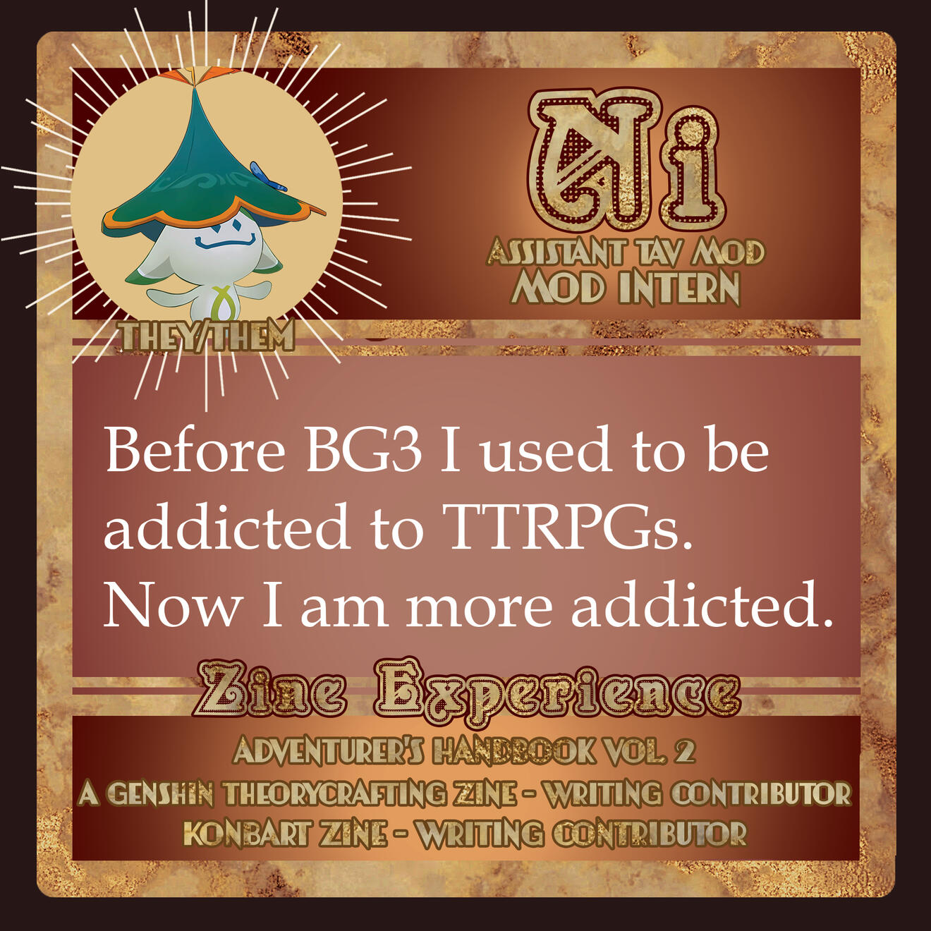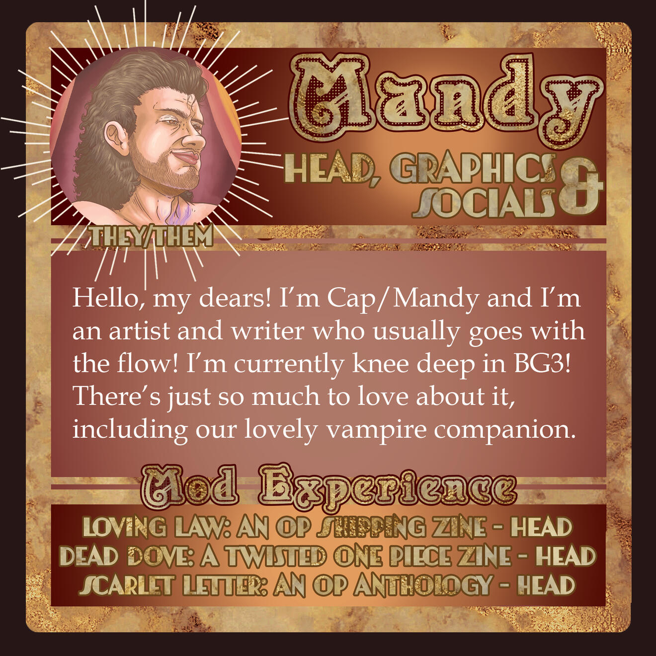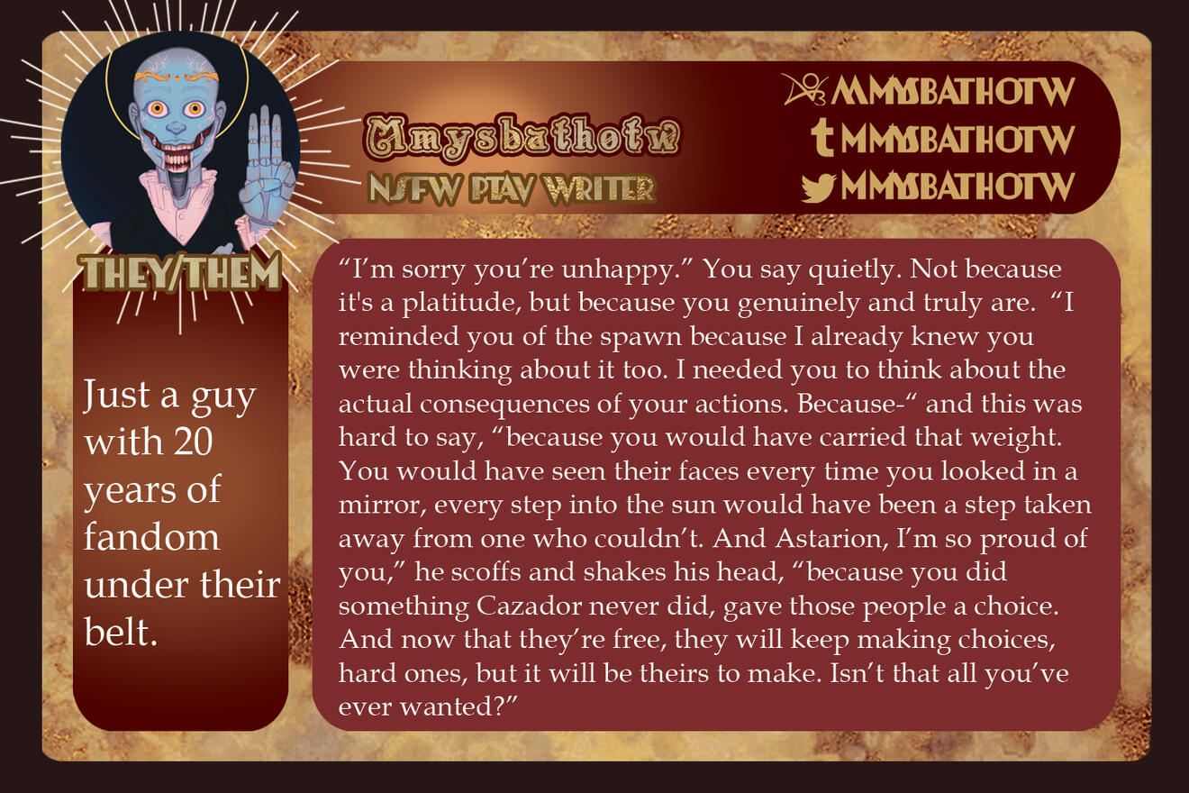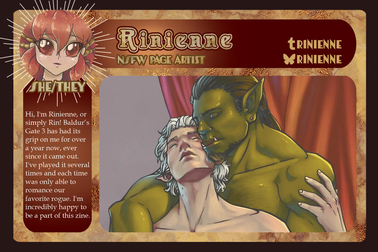 Those involved in the project are free to remain anonymous in the zine itself for their own reasoning and comfort. If you are in need of this extra support for your mental health, boundaries, and comfort, please let us know in the application, so we can accommodate you.Will this be an Astarion solo zine or will the content be Astarion ships? If yes to the latter, will these include Tav/OCs?