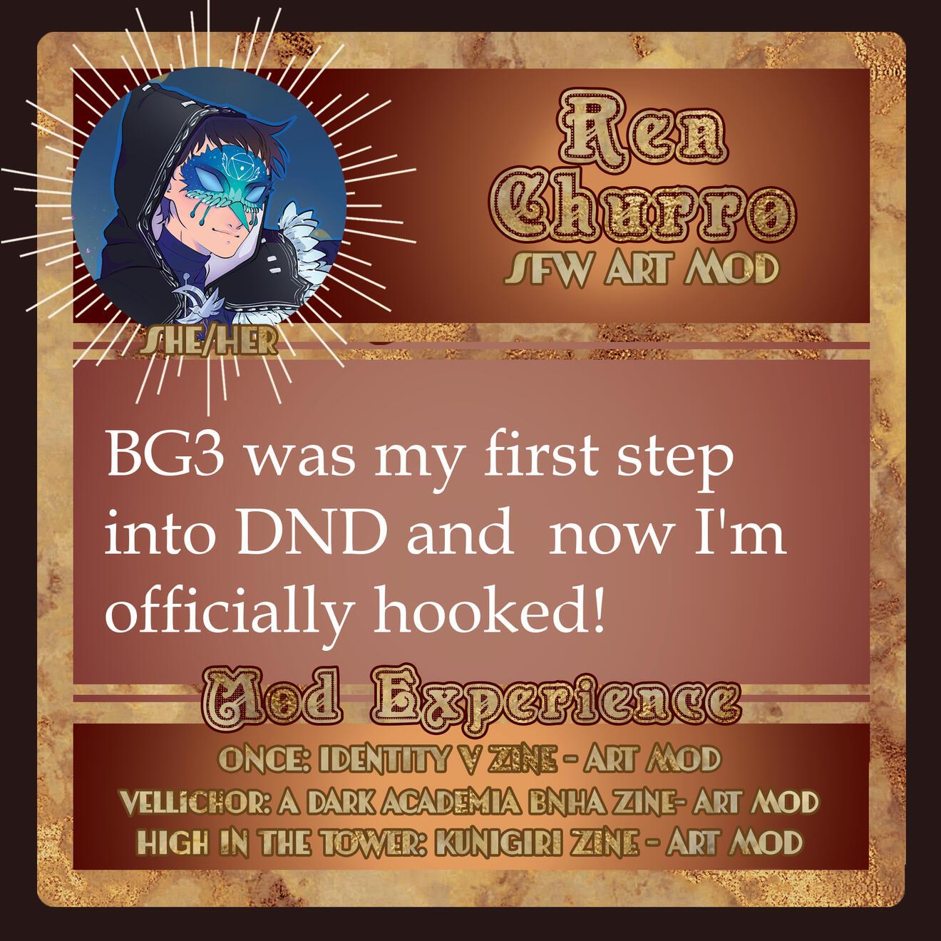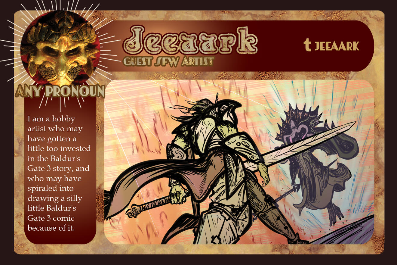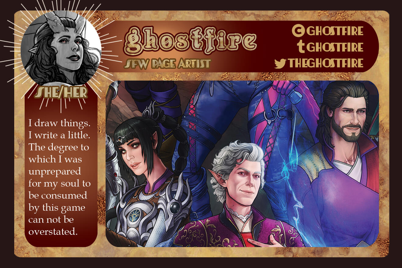 3-5 high-quality samples of your work. Not all of them have to be BG3 or Astarion related, if at all. Samples will give us a quick look into your work and can be included in your portfolio if you so choose.