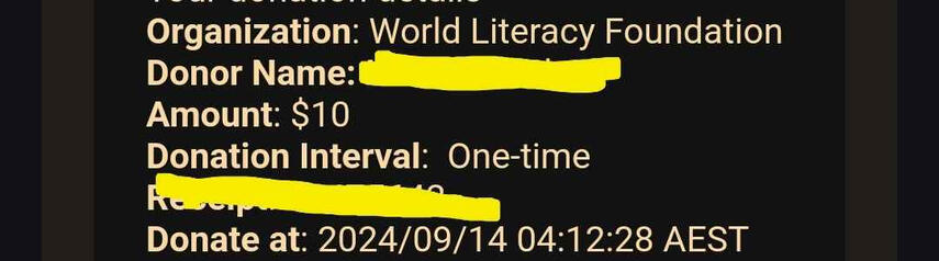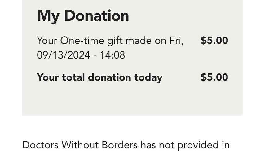 - Minimum donation amount is $5 USD or the equivalent in your local currency. ** You are free to donate more if you are inclined to do so.* If for whatever reason you are uncomfortable donating to the three listed, you may donate elsewhere as long as you have a receipt for it. We suggest keeping with Humanitarian Aid, LGBTQIA+, or SA Support if possible.** If using a currency significantly lesser than the USD, it is appropriate to make a donation in an amount you feel is relatively equal in your economy.It may take up to 24 hours for a Donation Receipt to be sent from your chosen charity.Once a receipt has been received, you are free to submit a pre-order form. You will need to provide your receipt with all personal identifying information redacted, the donation amount and currency, as well as the email you want the bundle sent to.All Zine Bundles will be sent out after March 29th, 2025!Here are some examples to prove a donation has been made. Again, it is advised and encouraged not to include any personal information. As long as the amount, date/time, and charity are included.