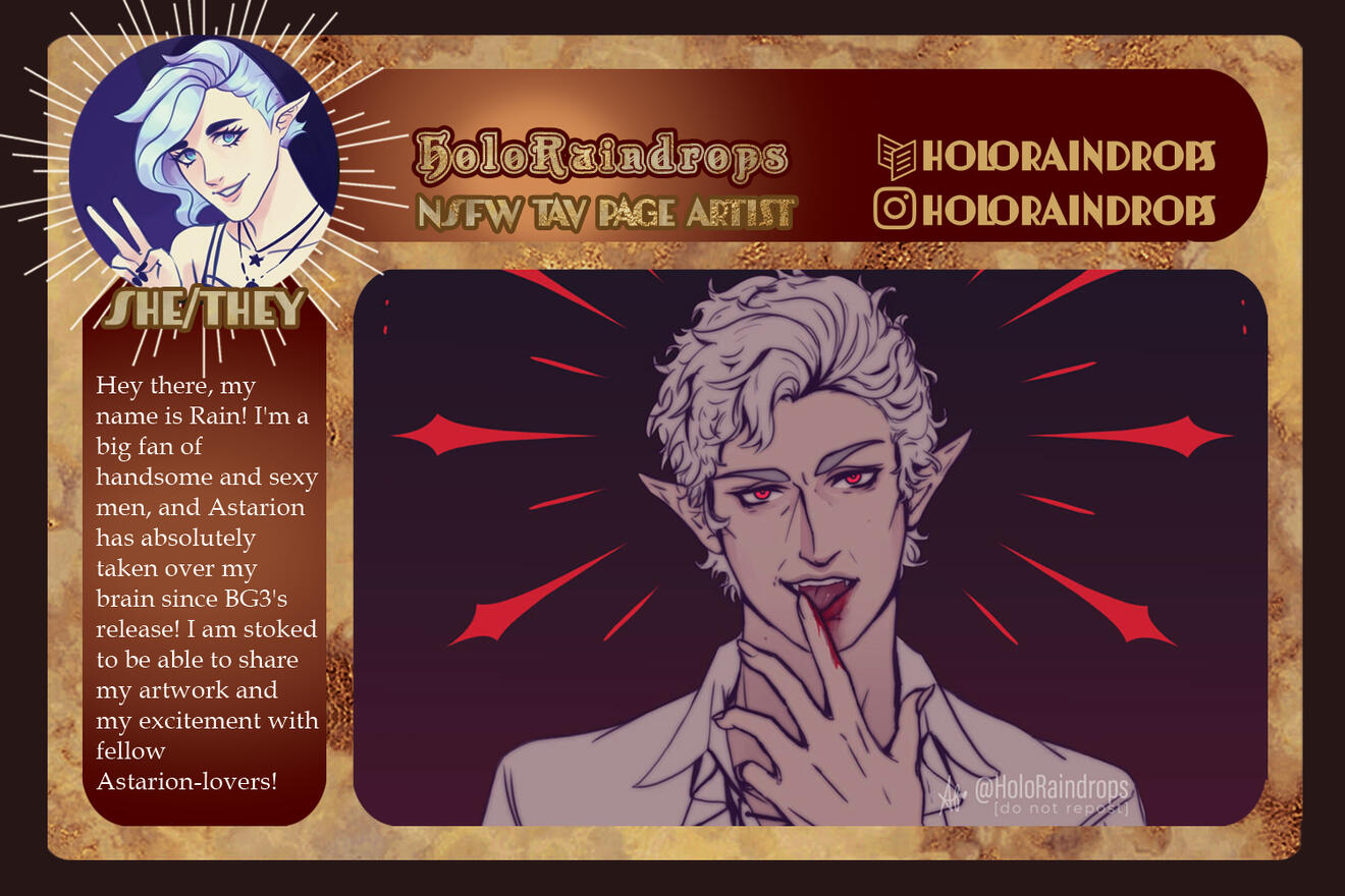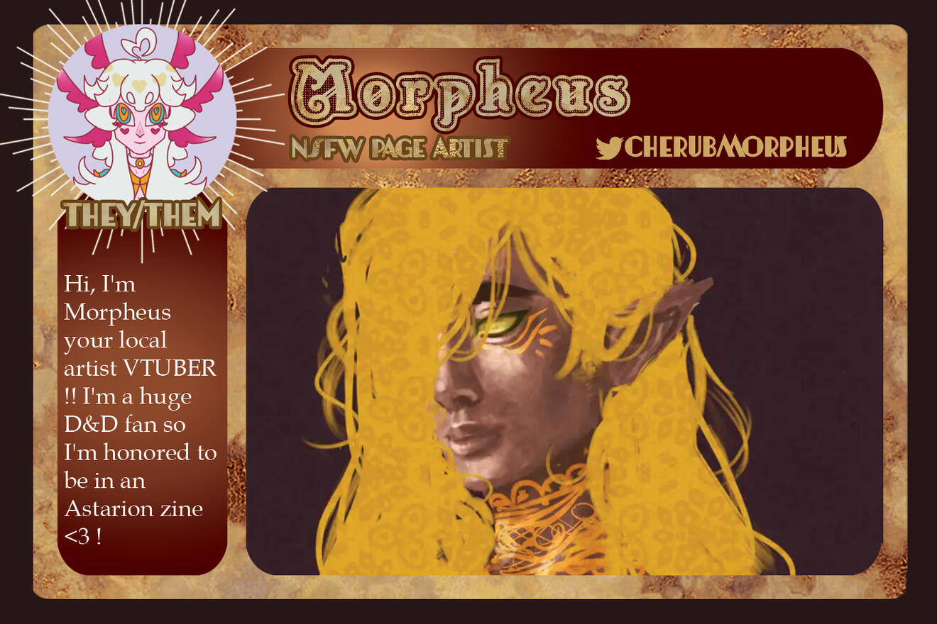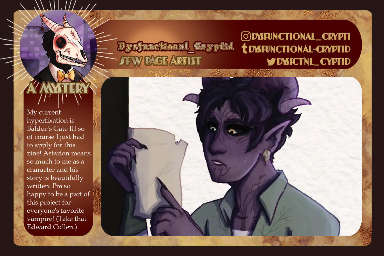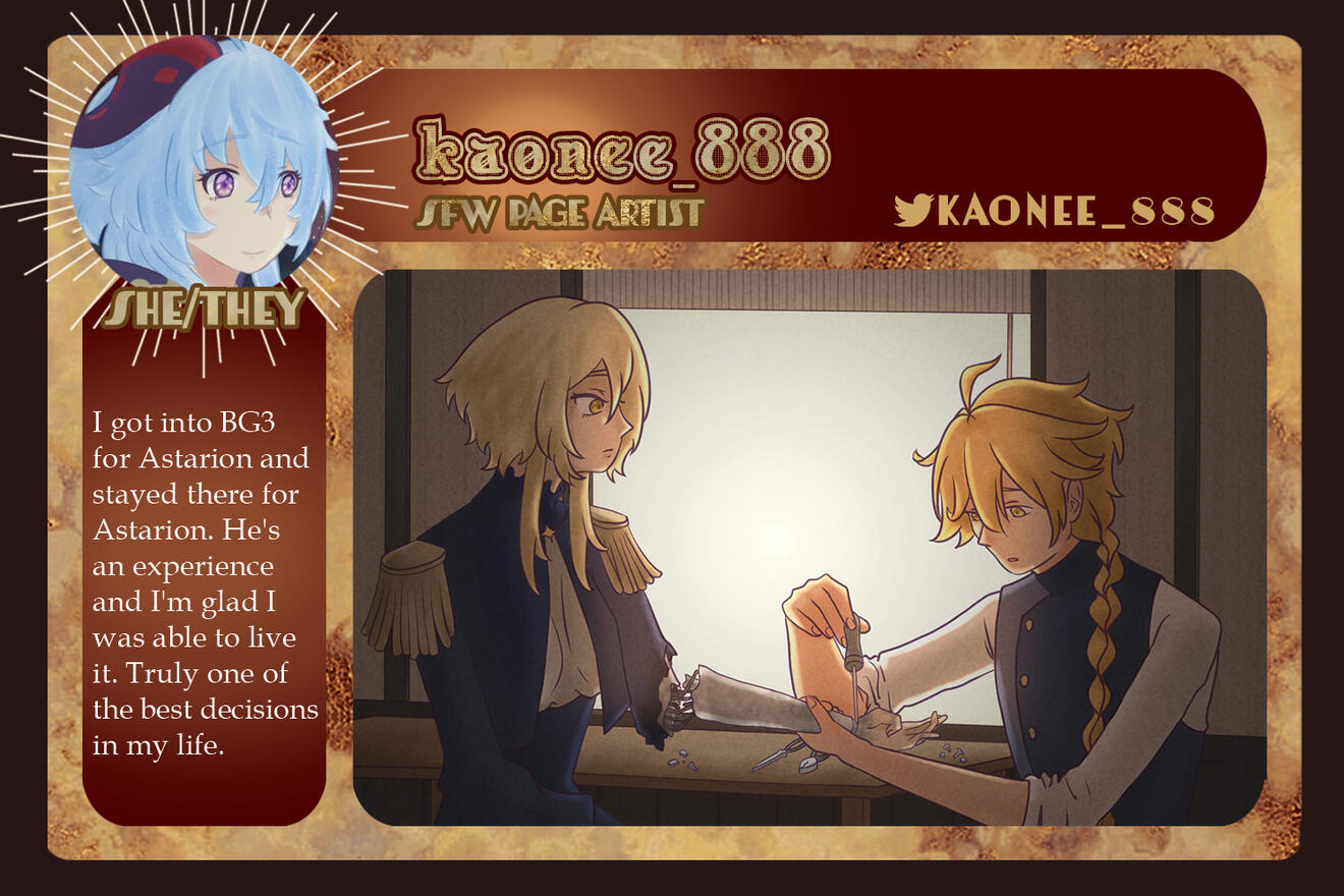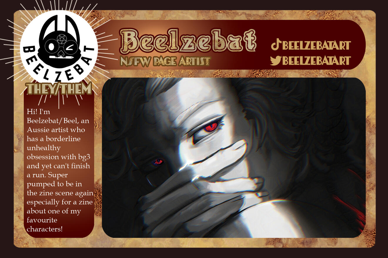 Those involved in the project are free to remain anonymous in the zine itself for their own reasoning and comfort. If you are in need of this extra support for your mental health, boundaries, and comfort, please let us know in the application, so we can accommodate you.Will this be an Astarion solo zine or will the content be Astarion ships? If yes to the latter, will these include Tav/OCs?