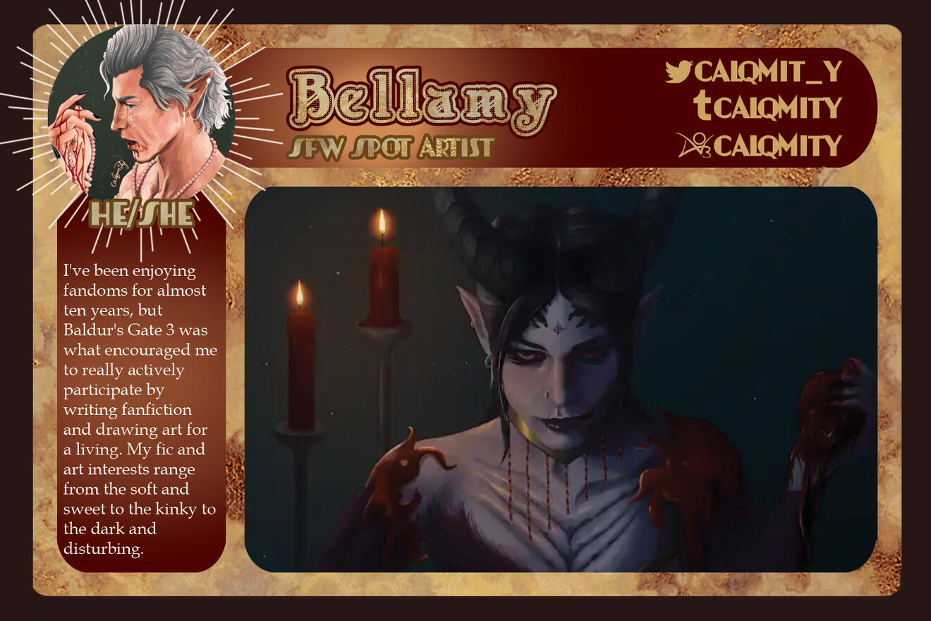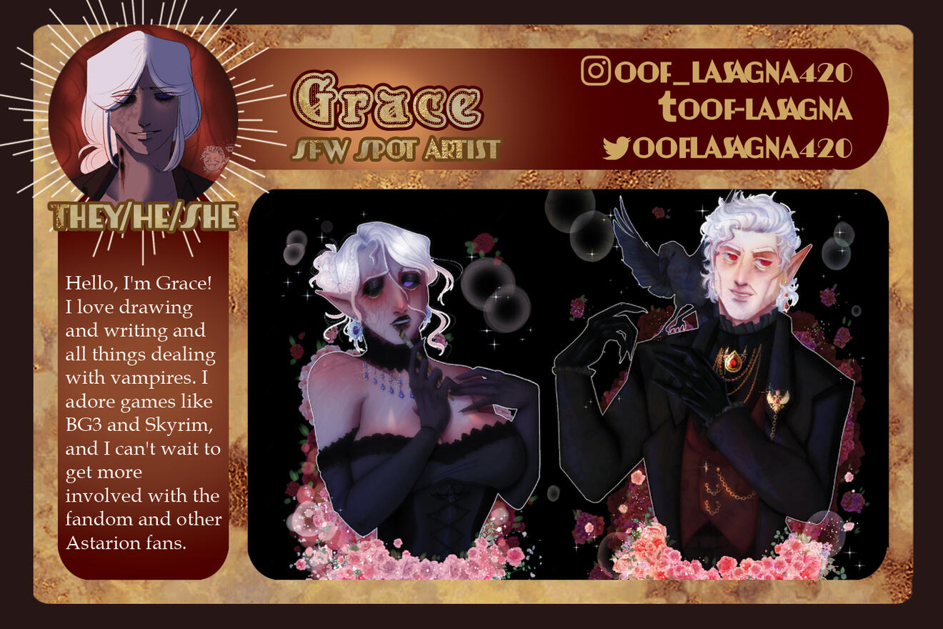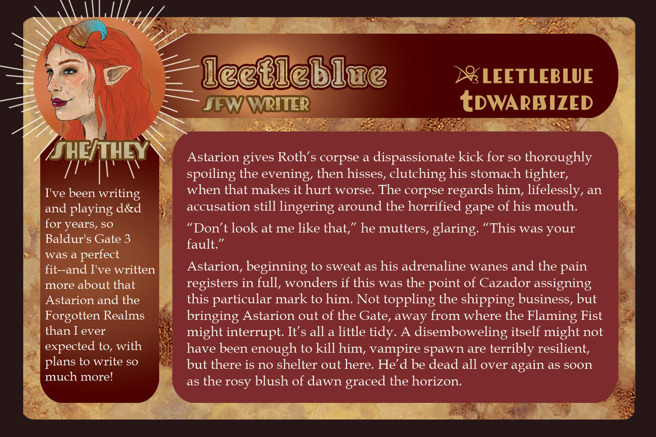 3-5 high-quality samples of your work. Not all of them have to be BG3 or Astarion related, if at all. Samples will give us a quick look into your work and can be included in your portfolio if you so choose.