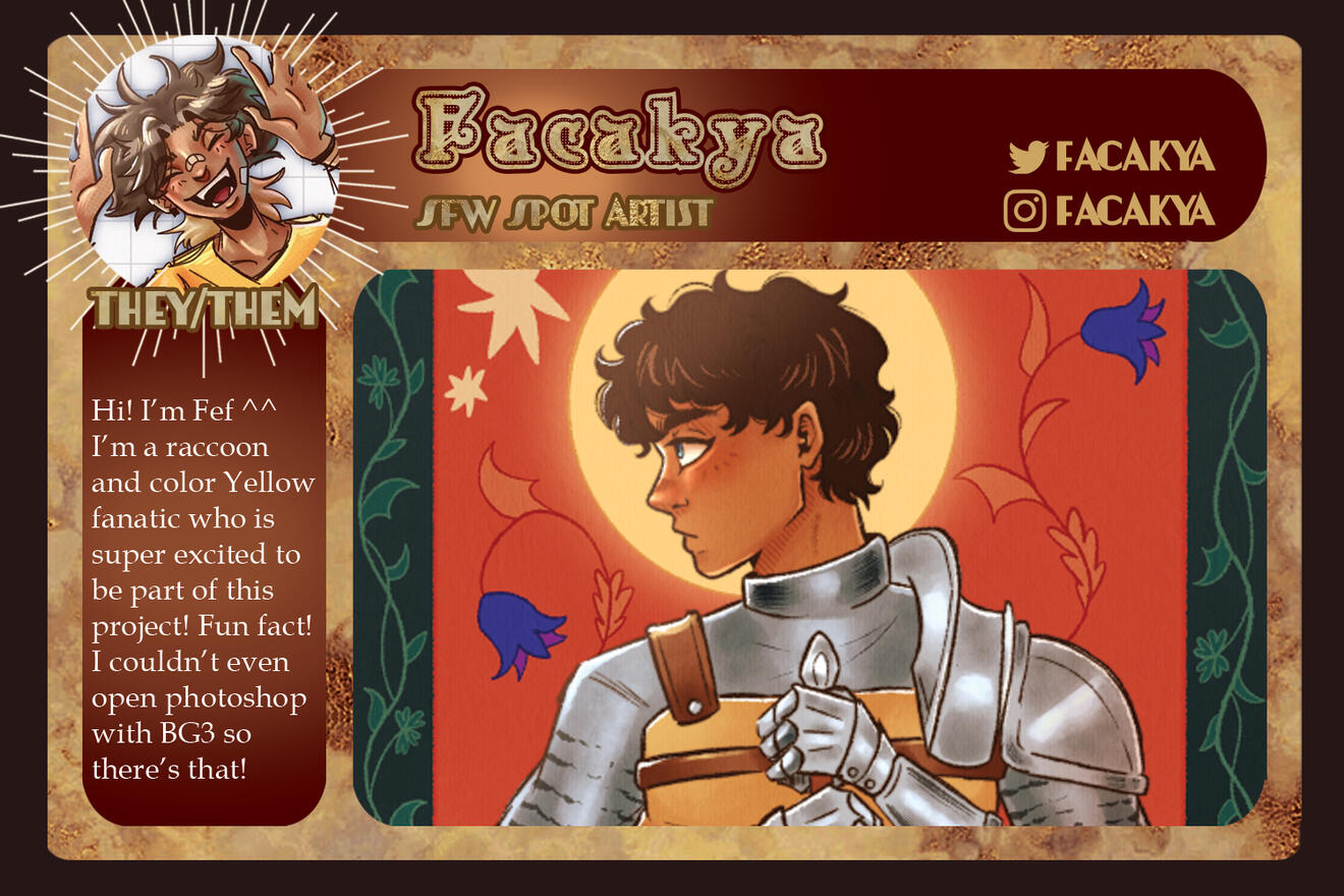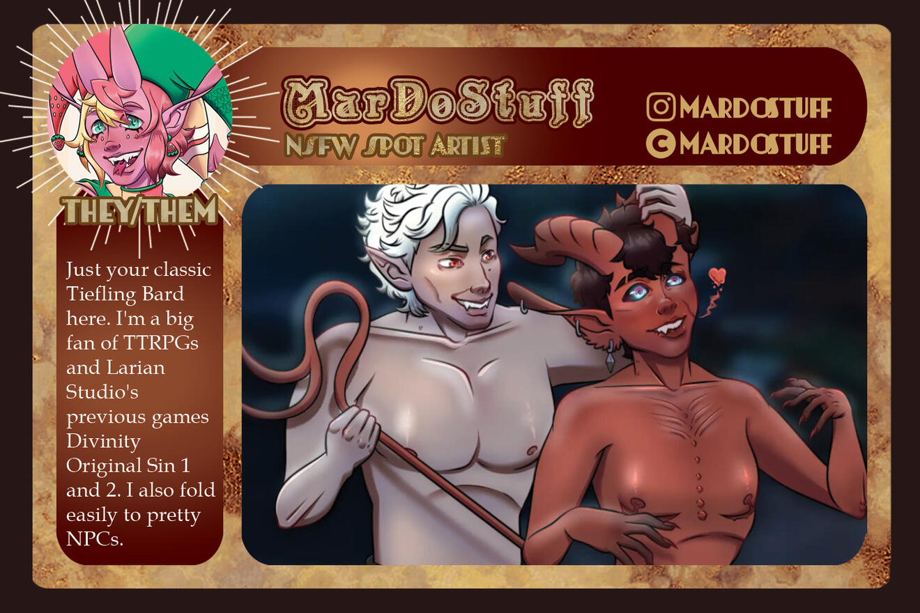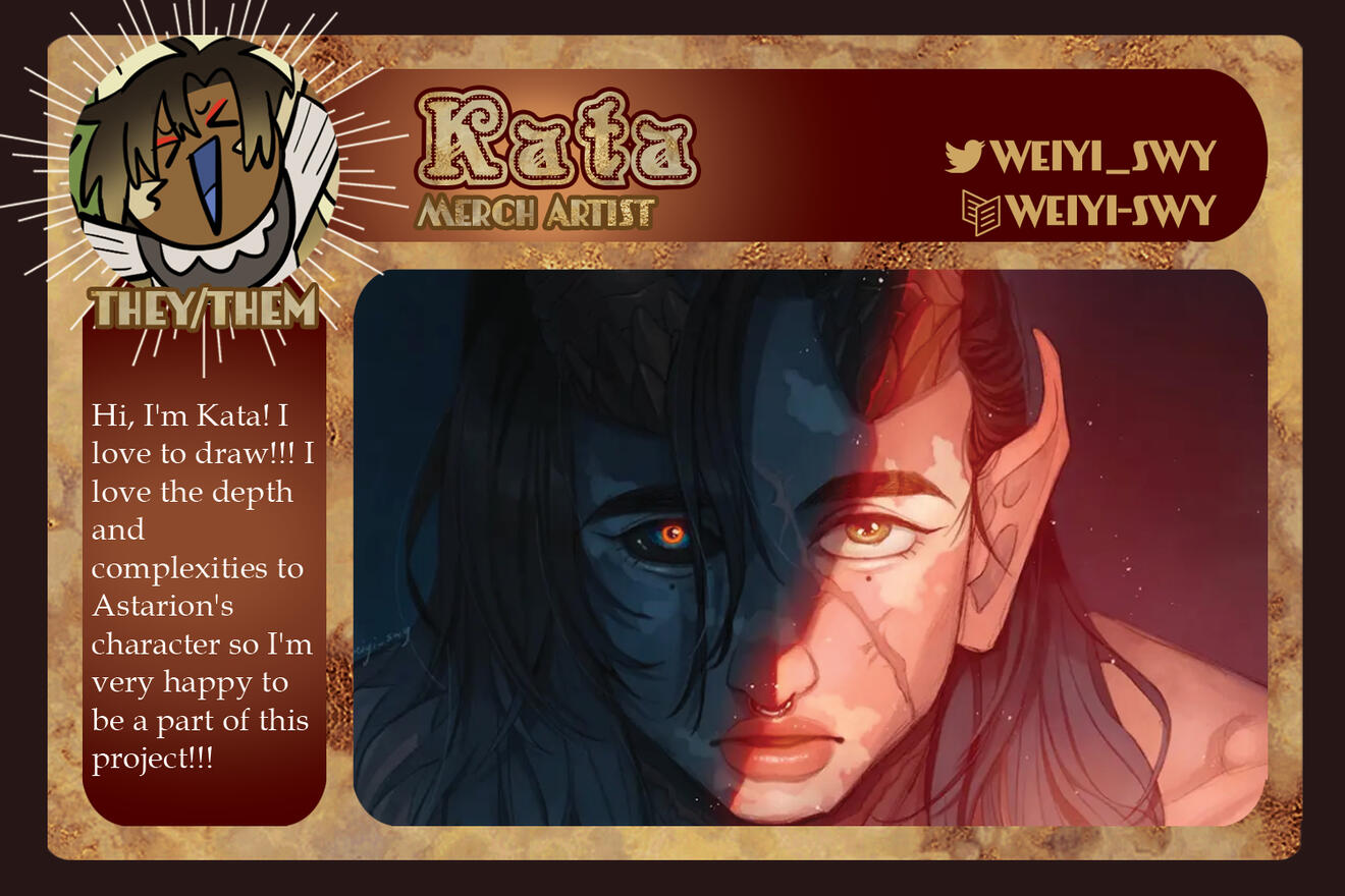 3-5 high-quality samples of your work. Not all of them have to be BG3 or Astarion related, if at all. Samples will give us a quick look into your work and can be included in your portfolio if you so choose.