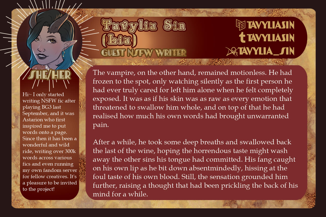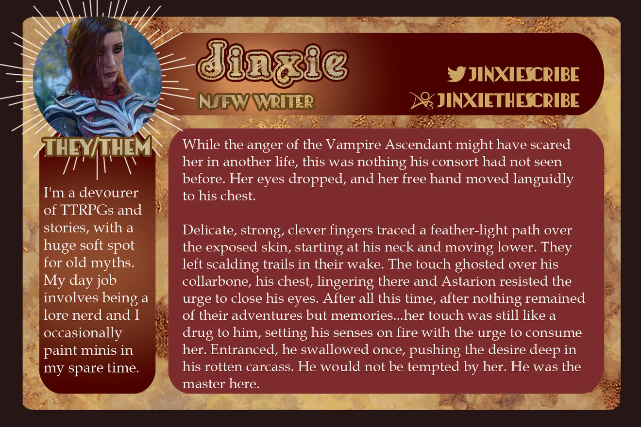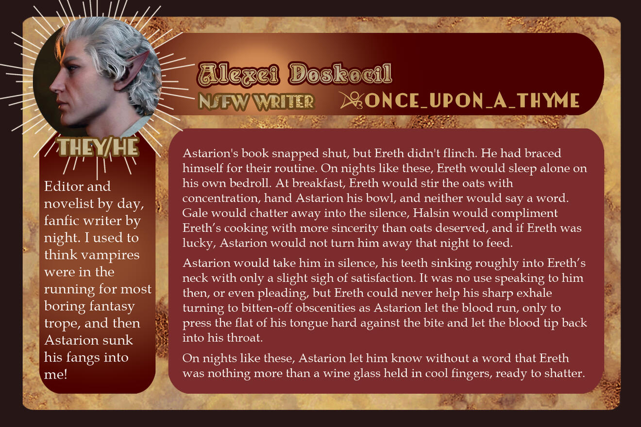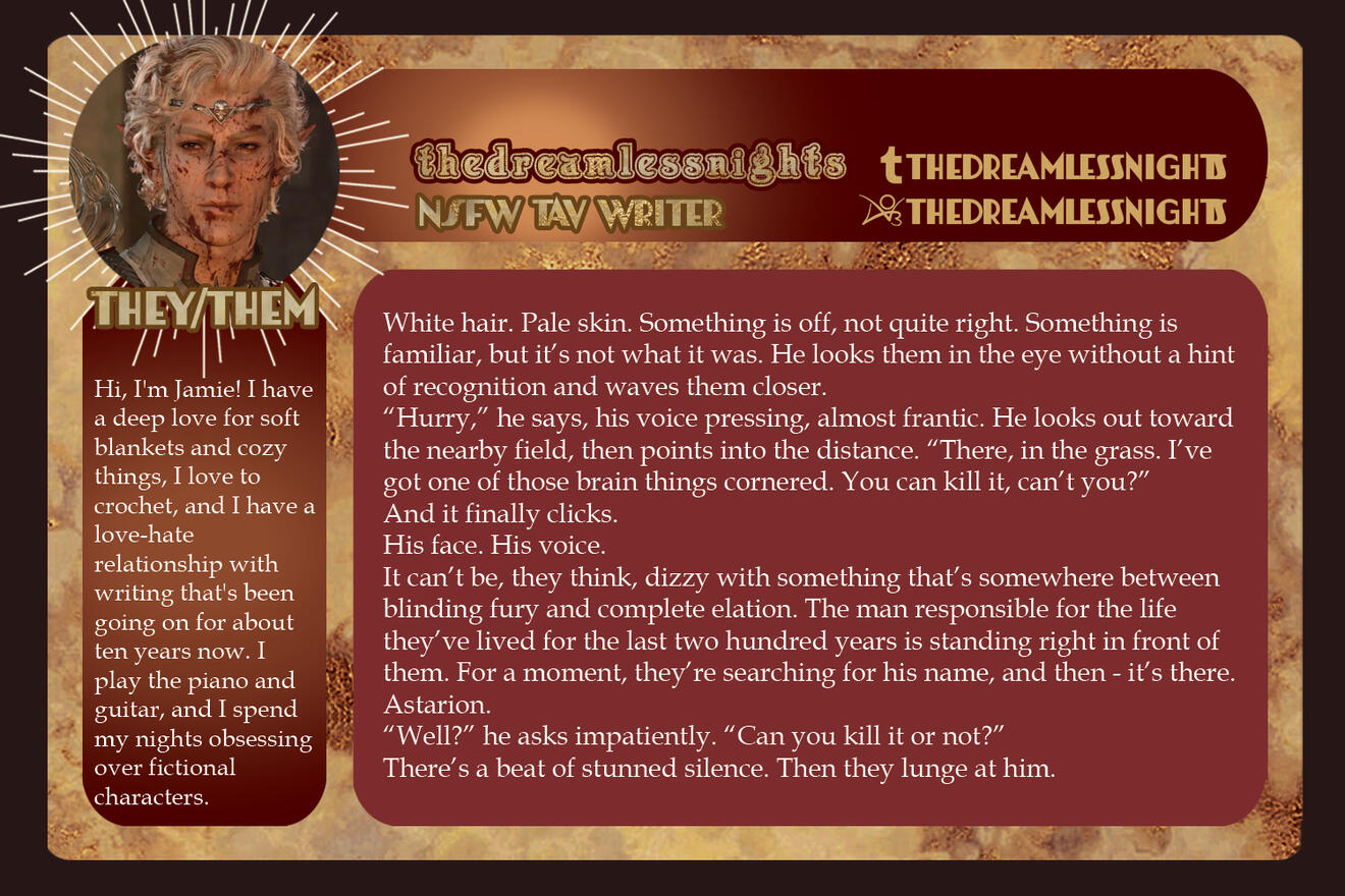 3-5 high-quality samples of your writing. Not all of them have to be BG3 or Astarion related, if at all. Samples will give us a quick look into your work and can be included in your portfolio if you so choose.