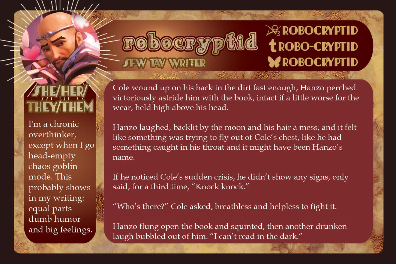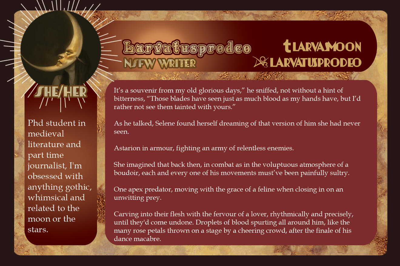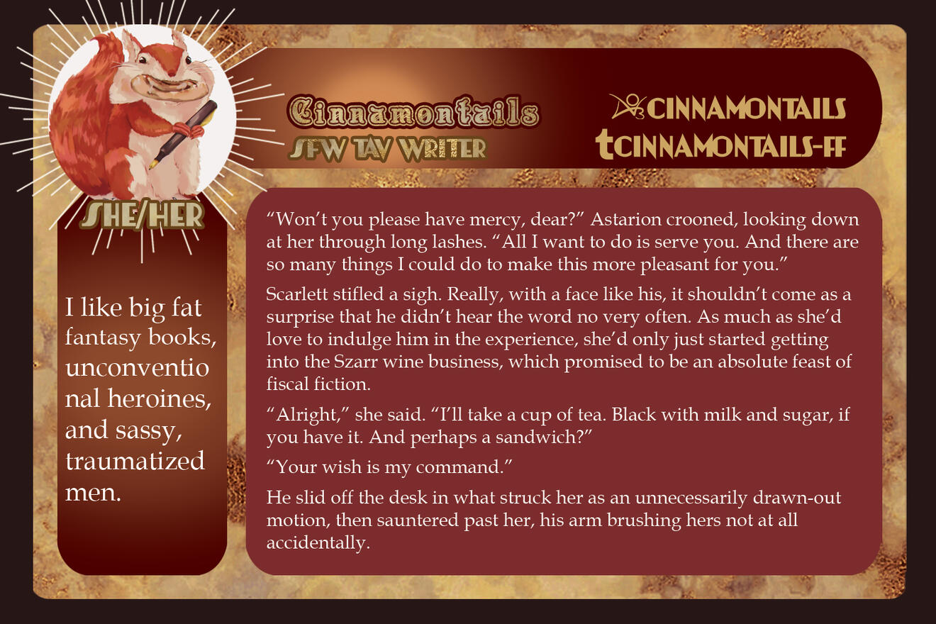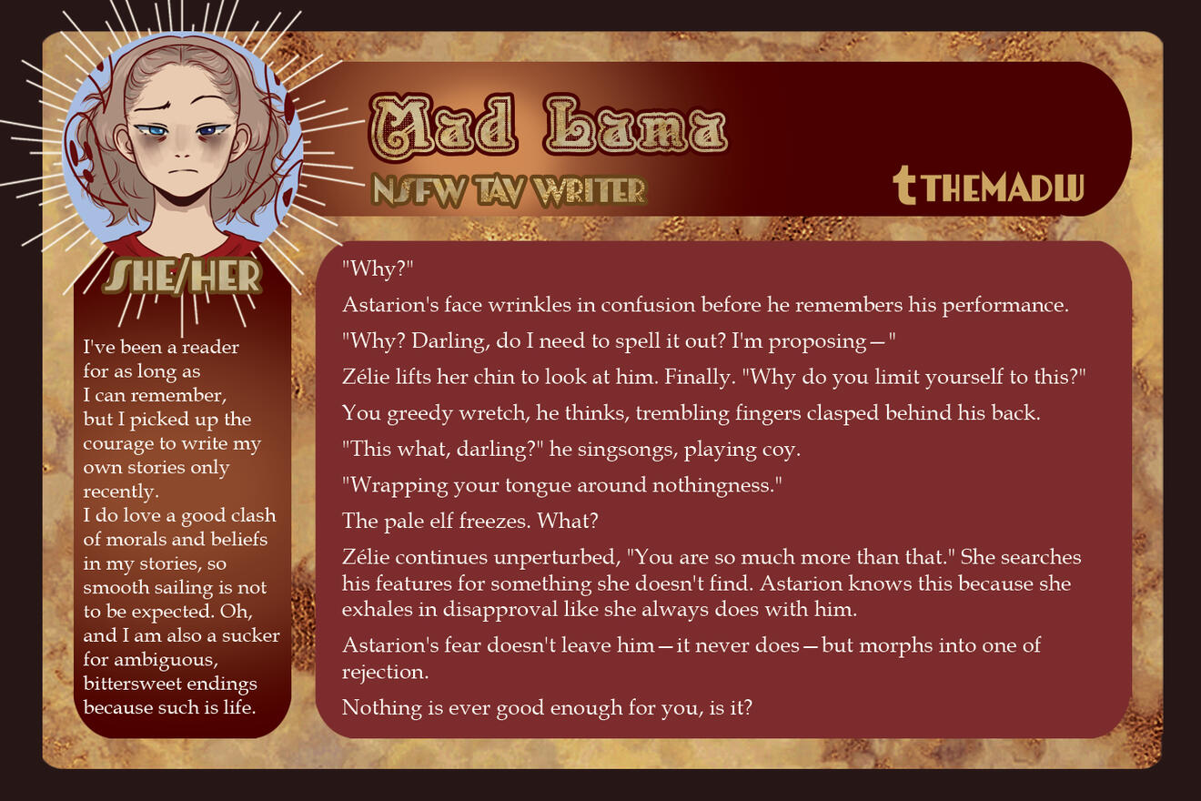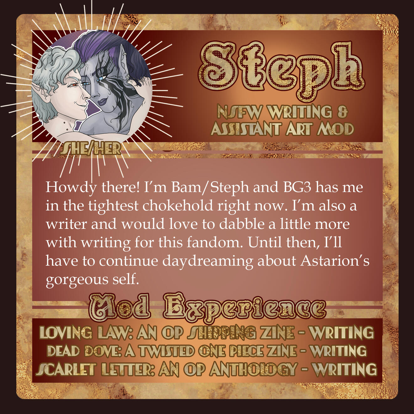 3-5 high-quality samples of your writing. Not all of them have to be BG3 or Astarion related, if at all. Samples will give us a quick look into your work and can be included in your portfolio if you so choose.