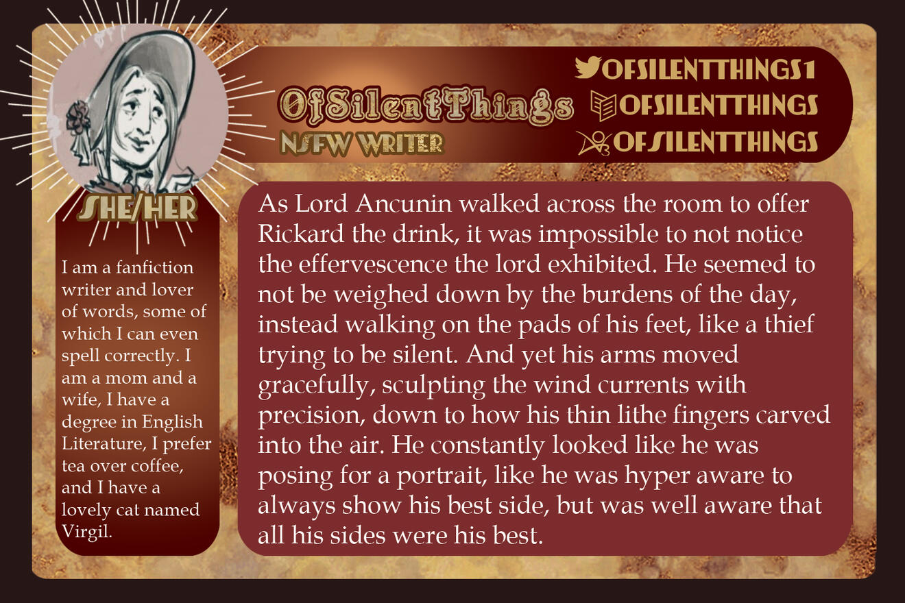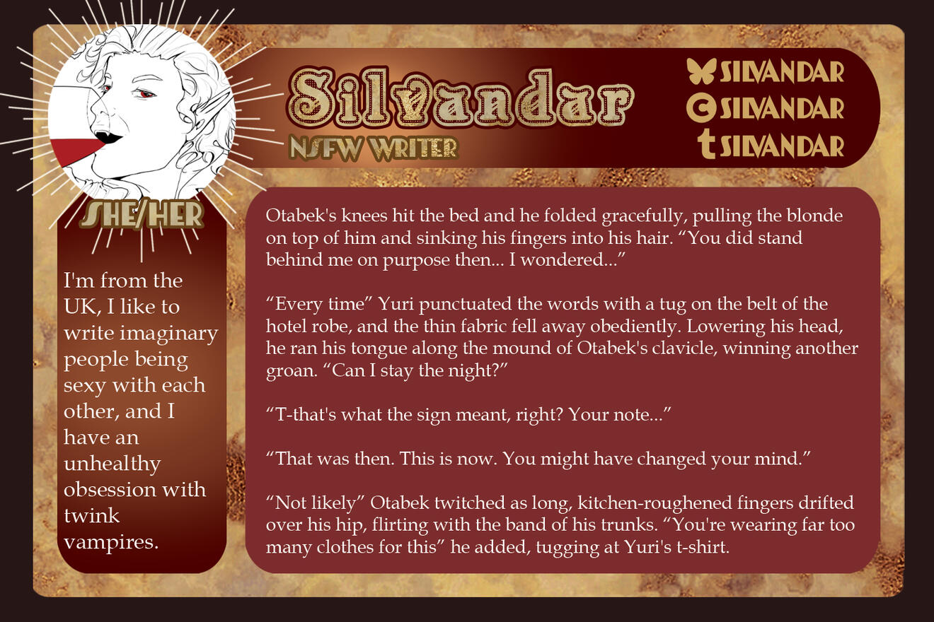 NSFW samples are accepted but those containing sensitive content such as non-con, dub-con, blood, gore, etc, must be tagged accordingly. If you have any questions as to what could be considered a trigger, please reach out to the head mod or use our Retrospring to inquire. (It is always good practice to have a separate section in your portfolio for NSFW content to keep it divided.)